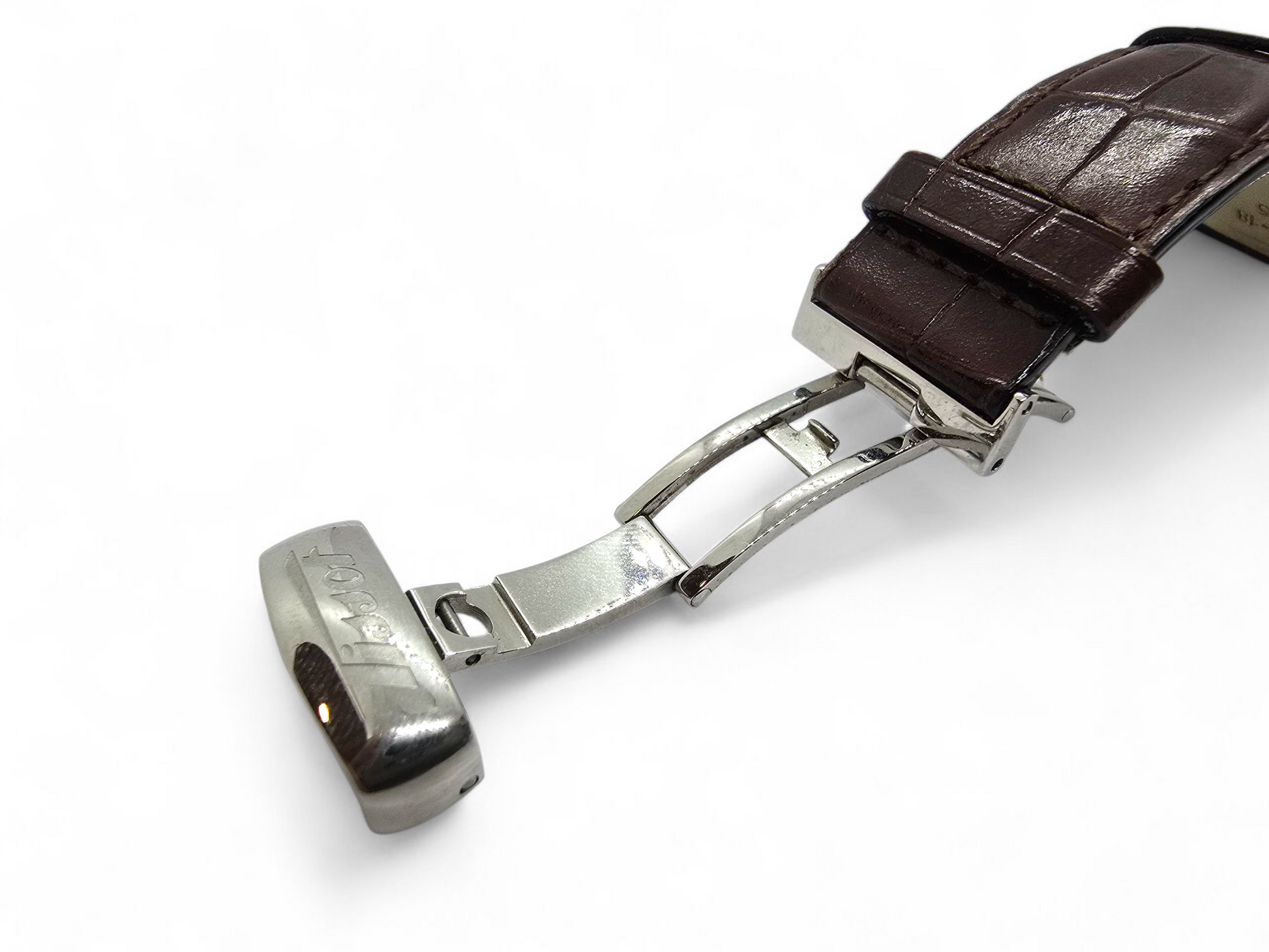 - Correa: Piel marrón con grabado de cocodrilo y cierre desplegable "butterfly" original de Tissot.