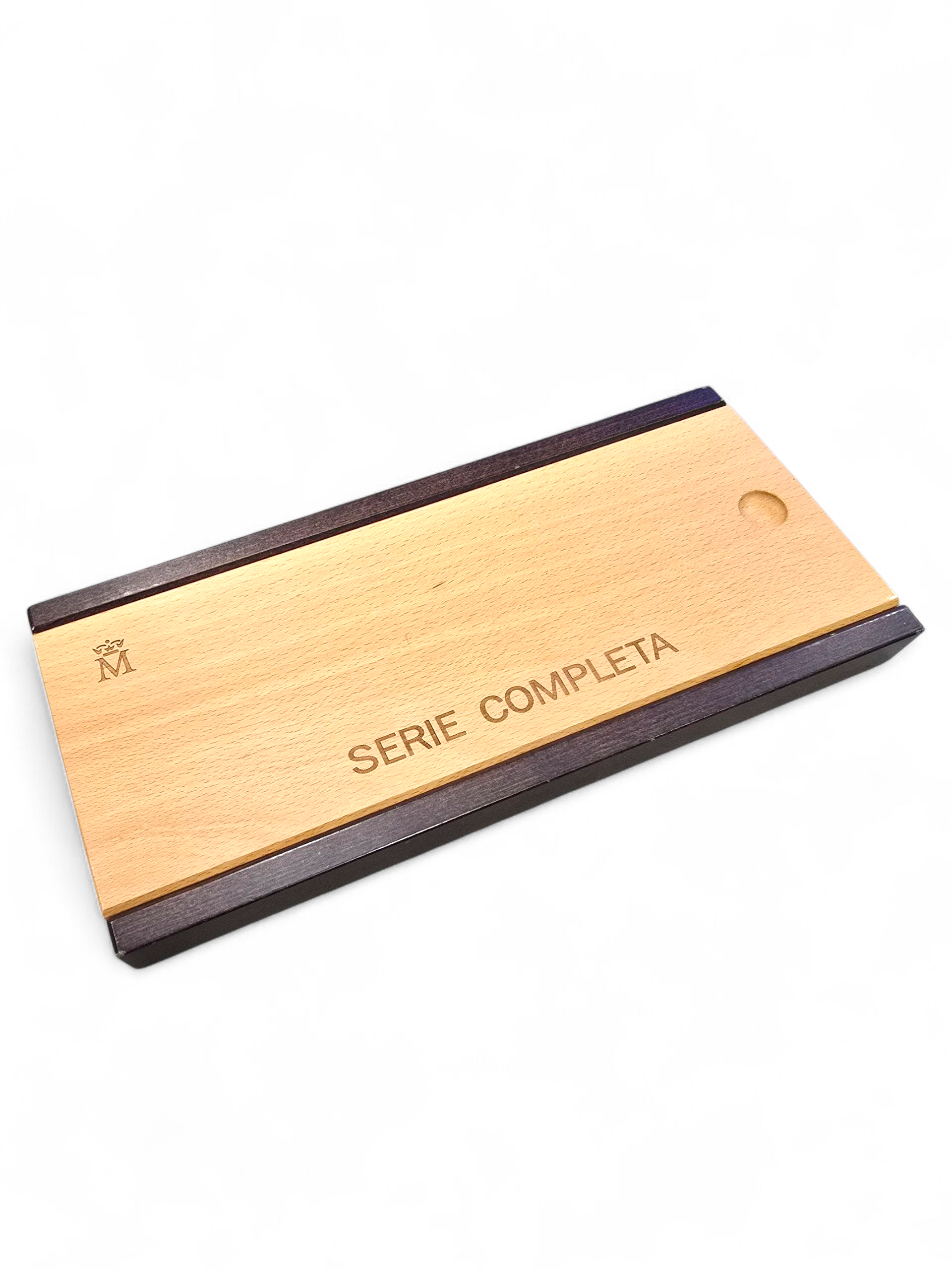 La colección se presenta en un estuche oficial de madera, elegante, robusto y perfecto para su conservación y exhibición.