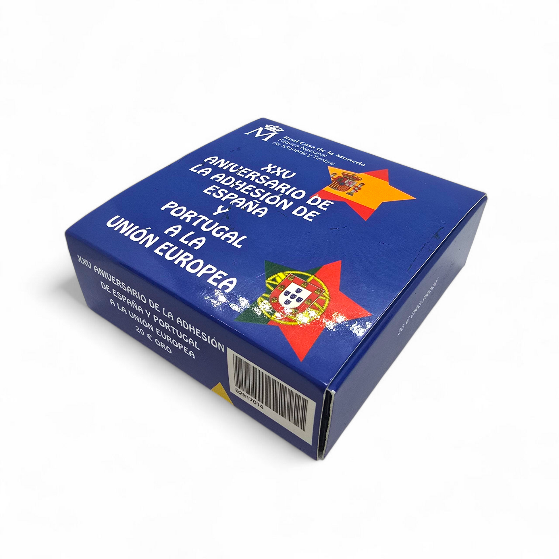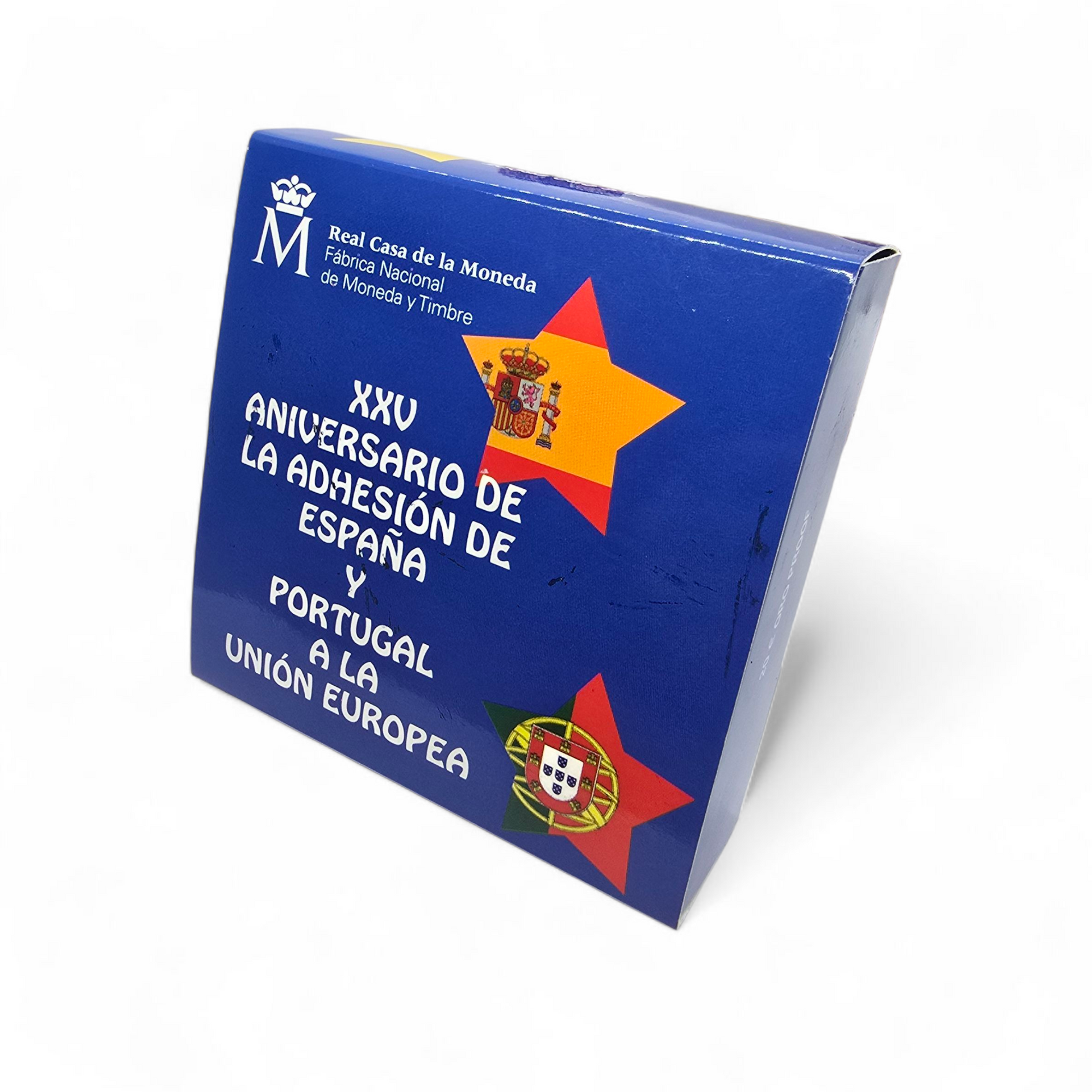 - En la leyenda se puede leer: “XXV ANIVERSARIO DE LA ADHESIÓN DE ESPAÑA Y PORTUGAL A LA UNIÓN EUROPEA” y “20 EURO”.