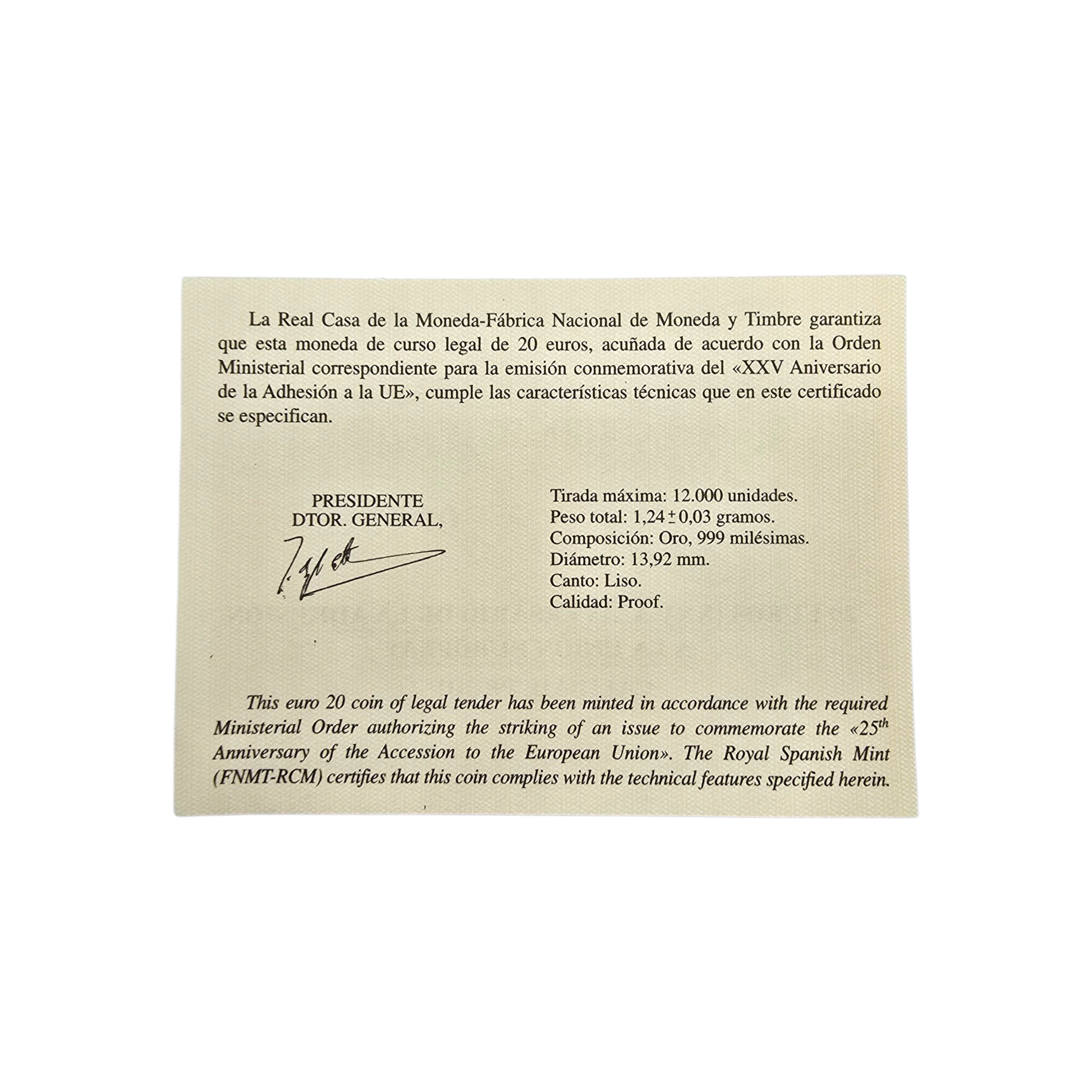 Moneda de 20 € en oro XXV Aniversario de la adhesión de España y Portugal a Europa